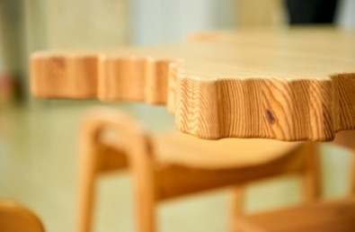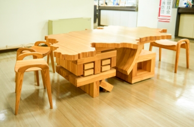 和山さんの作品は、各地で行われる作品展のほか、道の駅や雫石町役場などで見ることができます。雫石町役場2階には、町有林の伐採木材を使ったテーブルを設(shè)置。雫石町の全図を描いた天板と、漢字で「雫石」とかたどった腳など、一度見れば忘れられないユニークなデザインが印象的です。また1階には『七つ森ベンチ』も設(shè)置。座り心地も取っ手の感觸も柔らかで、木のやさしさがあふれています。「四ツ家さんには『材料を上手に使うことが最高の技術(shù)』と、福田さんからは『デザインはコミュニケーション』と學(xué)びました。今後も目の前のことをやりつつ、子どもたちと一緒に何かつくり続けられたらと思っています」(和山さん)