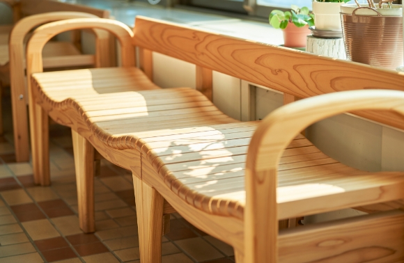 七ツ森の緩やかな山並みをイメージした『七つ森ベンチ』。體へのフィット感があり、立ち上がりの動作にも余計(jì)な負(fù)荷がかからない設(shè)計(jì)に