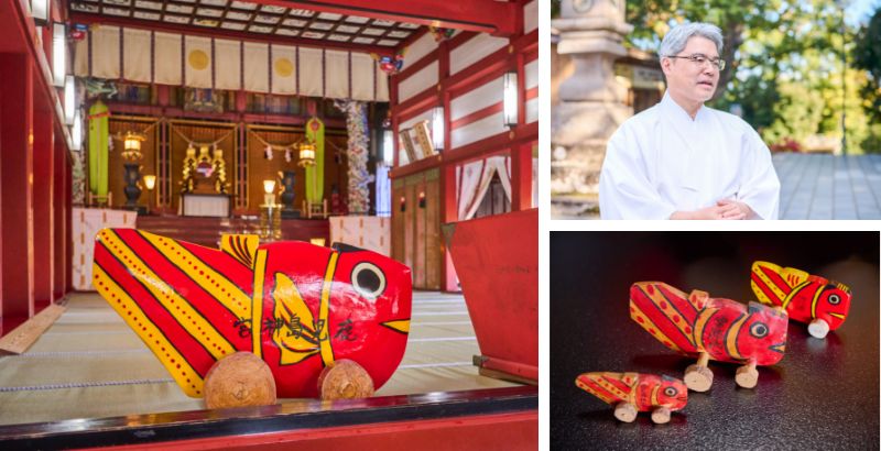 (寫真右上)「工房みやじさんには神宮の玩具を一手に引き受けてもらっています」と語る鹿児島神宮 権禰宜 宮內伸広さん。「鯛車は江戸時代の文獻『三國名勝圖會』にも出てきて、舊暦の3月10日に行われた藤祭りに、鯛車の屋臺がたくさん並んでいたという當時の様子が記されています」