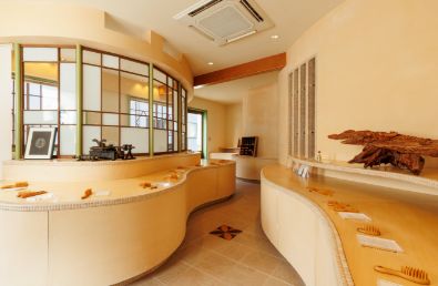 (寫真右)流線形のレイアウトが印象的な店舗內(nèi)観。一角には彫り物の工程作業(yè)を行う作業(yè)場(chǎng)も