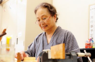 (寫真左)つげブラシづくりの中で、いちばん好きなのは歯を挿す工程と語る安藤賀子(よしこ)さん。「いろんな職人が手を加えてきた集大成の場(chǎng)面。最後の瞬間まで大切に丁寧に仕上げます」