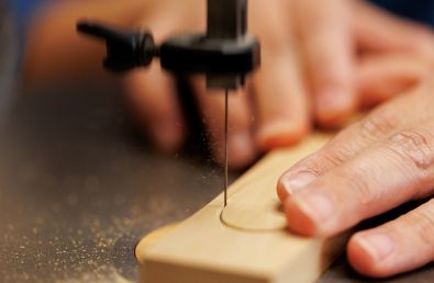 (寫真左上)南米産の木材、カステロにつけた下書きの上を、電動(dòng)ノコギリで柄の形に削る