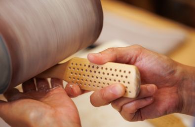 別府つげ工蕓では、水が滴る生木のつげを皮剝きし、乾燥させるところから作業(yè)を開始。工房に在籍する6人の職人が丸太を板狀に、さらにヒゴ狀に細(xì)く裁斷して、最終的に磨きをかけて歯に仕立てていきます。柄の部分はリコーダーなどにも使われる南米産の木材、カステロを採用。裁斷、加工、形成と、機(jī)械を使って行われる作業(yè)を見ていると、どの工程も迷いのない動(dòng)きに見えますが、目で確認(rèn)できない木の中の狀態(tài)を手の感覚で探りながら行われるという、実に繊細(xì)な作業(yè)の連続です。