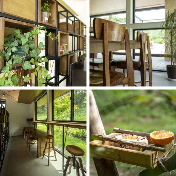 本棚やカウンタースペースもある杵築シェアサロン。山側に面した窓からは、野鳥用の餌箱の様子もうかがえます