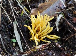 雑木林に生育する傘のない鮮黃色のキノコ。太く人の指のような形をした赤色のカエンタケは猛毒