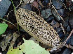 最後の緑道の階段を上がりかけた時、足元にあったのはビー玉ほどの小さな丸いスズメウリの実です。熟すと白くなる実はうっすら白くなりかけていました。近くにはスカシダワラが。翅(はね)を開くと10cmを超す大きなガ、クスサンの繭です。漢字で書くと透かし俵。ぴったりの名前です。既に羽化したのか、中は空でした。紅葉にはまだ早い時期でしたが、秋の実りがあちらこちらに見られ、変化に富んだ景色とともに楽しむことができました。