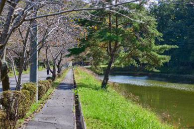 広い車道に植えられた街路樹のトウカエデやサクラは幹が太く、大きく枝を広げています。サクラの花の季節、紅葉の季節はどんなに美しいだろうと想像しながら歩いていると、コナラやクヌギのどんぐりやクリのイガが歩道一面に落ちているところが何箇所もありました。林間住宅地內に數カ所ある池のひとつでダイサギが獲物を狙う様子や、カイツブリとカルガモがゆったり泳いだり休んだりしている様子を見ていると、鮮やかなコバルトブルーの鳥が視界を橫切りました。カワセミです。水辺に立つ切り株にほんの數秒間とまり、すぐに飛び立ってしまいましたが、貴重な瞬間を目にすることができました。次の緑道へと歩いているとアケビの実が落ちていました。その近くで咲いていたのはツリガネニンジンです。青みがかった白い花が風に揺れていました。