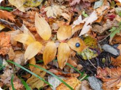 蔵王連峰の東の麓に広がるロイヤルシティ宮城蔵王リゾートは、カエデの仲間をはじめコナラ、クヌギなどの落葉樹(shù)と、アカマツやカラマツなどの針葉樹(shù)に覆われています。訪れたのは11月中旬。森は晩秋を迎えていました。紅葉する落葉樹(shù)が多いため森は黃金色に染まり、ところどころに赤く紅葉した木々が彩りを添えています。そんな中を歩き始めると、林縁に黒くて丸いチゴユリの実を見(jiàn)つけました。木の枝から垂れ下がって風(fēng)に揺れていたのはカエデドコロの種子です。