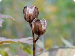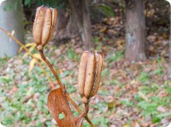 長(zhǎng)く伸びた莖に、蒴果(さくか)と呼ばれる円柱形の果実をつけているのはヤマユリです。熟して割れると薄い翼をつけた300個(gè)以上もの種子が、風(fēng)に乗って遠(yuǎn)くに運(yùn)ばれます。少し進(jìn)むとヤマユリより丸いウバユリの蒴果がありました。東北地方では大型で花數(shù)が多いオオウバユリが分布していますが、この株は草丈や花の數(shù)からウバユリと思われます。近くではテンナンショウの仲間が真っ赤な実をつけていました。黃色い葉が遠(yuǎn)くからも目を引くのはオオバクロモジです。枝先に尖った葉芽と丸い花芽をつけ、春に淡い黃緑色の花を咲かせる準(zhǔn)備を始めています。