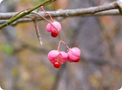 晩春に緑白色の4弁花をつける。ピンク色の果実は秋に熟すと4裂し赤い種子が顔を出す。紅葉が美しい。ニシキギの仲間
