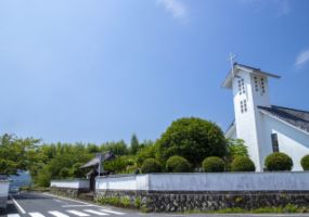 白壁の塀の向こうにたたずむ杵築カトリック教會(huì)