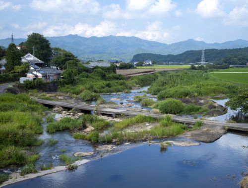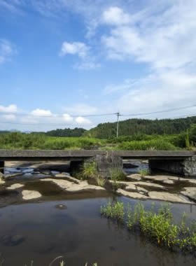 市街地から、少し足を伸ばしてみましょう。大分県には、沈下橋(沈み橋)が多數(shù)現(xiàn)存しているといわれています。大昔の阿蘇大噴火によって溶結(jié)凝灰?guī)rが堆積し、広くて淺い谷底(こくてい)平野という獨(dú)特な地形に。農(nóng)地と川床の高低差が少ないため、橋も増水時(shí)には水面下に沈みます。田園広がる杵築市山香町には、日本最古の石造沈下橋(沈み橋)「龍頭橋」が殘り、橋のたもとに平らな川床が見え隠れする獨(dú)特な風(fēng)景を描いています。