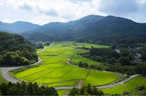杵築市の隣、豊後高田市の山間には、1200年もの歴史を持つ荘園「田染荘(たしぶのしょう)」が殘っています。山々に囲まれた中で美しい曲線を描く水田は、もともとの土地の地形を利用してつくられたもの。宇佐神宮の根本荘園のひとつで、昔のままの姿が守り続けられるのはここ、小崎地區(qū)のみです。2010年(平成22年)に國(guó)の重要文化的景観に選定され、2011年(平成23年)12月にはユネスコ未來(lái)遺産に登録。さらに2013年(平成25年)5月には國(guó)東半島を含む一帯が、世界農(nóng)業(yè)遺産に認(rèn)定されました。