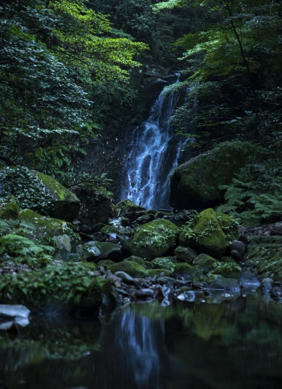 山香町の「羽門(うど)の滝」は落差約12mの小さな名爆。ひんやりと澄んだ空気に包まれる中、苔(こけ)むした巖をたたく白い滝の様子からか、白竜が潛むといわれる秘境の滝です。