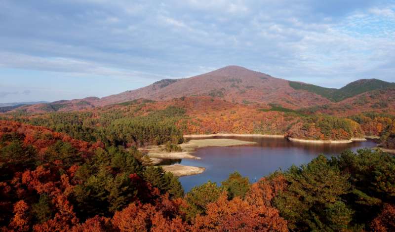 蕓北聖湖畔リゾートからも望める臥龍山は、その名のとおり竜がひれ伏しているようななだらかな山容を見せています。山頂にかけて樹齢200年以上のブナの原生林が広がるほか、臥龍山北面は、日本の濕原分布のほぼ南限にあたる八幡濕原もあり、珍しい濕原植物や鳥類、昆蟲が生息しています。