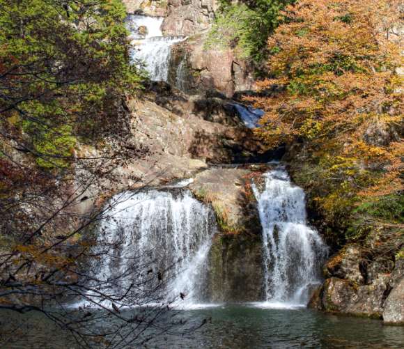 紅葉の原生林に包まれて美しさを増す、三段峽上流にある三ツ滝