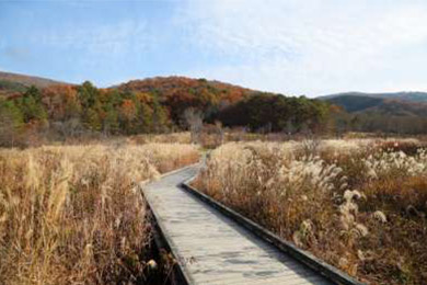 (寫真左)美しいススキ野原が広がる千町原 (寫真右)木道を歩いて、濕原內が散策できる霧ヶ谷濕原は約17haの広さを誇る