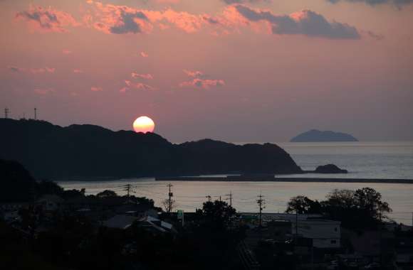 道の駅「ゆうひパーク浜田」から見える夕陽。弓形に続く浜田市の向こうに美しく沈む
