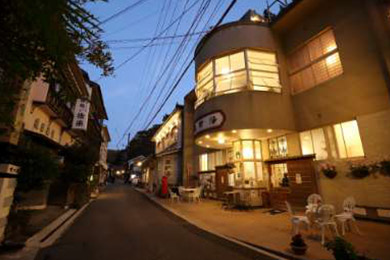 (寫真左)外湯に出かける人でにぎわう夕刻の溫泉津の溫泉街