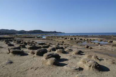 (寫真右)石見畳ヶ浦。丸い石はノジュールと呼ばれ、貝の炭酸カルシウムなどが溶け出したところに化石や砂粒が固まり、侵食を受けながら殘ったもの