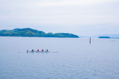 伯耆町に隣接する米子市は、日本海に面する美保灣と中海(なかうみ)の間を細長く続いています。中海は海水と淡水が混ざり合う「汽水湖」に分類され、上流部は宍道湖(しんじこ)と、下流部は日本海へとつながります。米子で古くから盛んなローイング(漕艇)の大會や練習場としても知られ、この日も何艘ものボートが、中海の穏やかな水面で練習に勵んでいました。夕暮れどきには、赤く染まる夕景が美しいことから、地元では古くから、中海のことを「錦海(きんかい)」と呼んでいます。