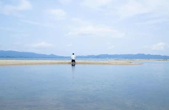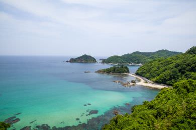 隠岐島に面する島根半島の北側は、小さな入江や小島が入り組んだリアス海岸が続きます。複雑な道のりを経て、目の前に広がるのは、玉結(たまゆ)灣を臨む笹子海岸。小規模な海岸ながら、白砂が広がる浜と遠淺の海のエメラルドグリーンに、思わず息を呑むことでしょう。
