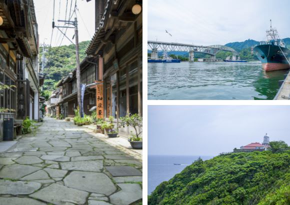 (寫真左)漁村の繁栄を物語る青石畳通り。ここだけタイムスリップしたような獨特の佇まい (寫真右上)鳥取県と島根県を結ぶ境水道大橋 (寫真右下)美保灣を隔てて大山や弓ヶ浜、遠く隠岐の島を望む美保関燈臺。1998年(平成10年)には「世界の歴史的燈臺100選」に選ばれた