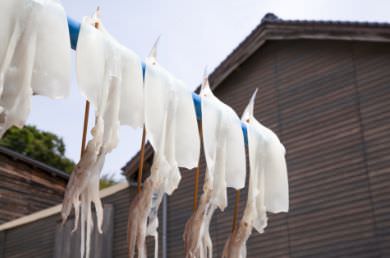 (寫真右)美保関漁港近くの軒先に並ぶイカの一夜干し。漁師町ならではの光景だ