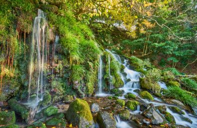 (寫(xiě)真左)「霧島の七不思議」に數(shù)えられる若宮神社と御手洗川 (寫(xiě)真右)白い水飛沫をあげながら、苔むした巖肌を走る御手洗の滝