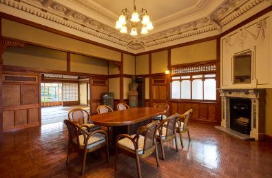 庭園を望む座敷の隣に、洋間の応接室がレイアウトされた舊田中家別邸