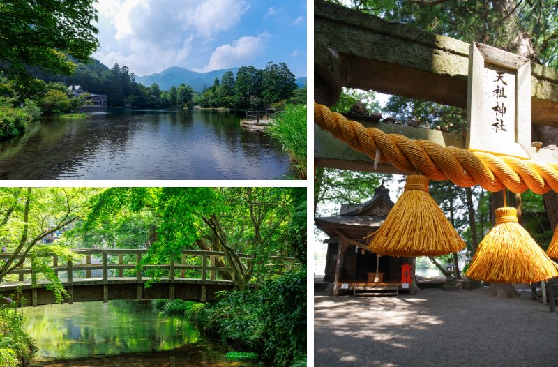 由布岳の裾野に広がる金鱗湖(きんりんこ)は、清水と溫泉が入り混じる珍しい湖です。清水と溫泉は湖底から湧き出ていたり、湖に流れこむ川に溫泉水が混じっていたりするため、一年通して水溫が高いのが特徴。冷え込みのきつい朝にはその溫度差で湖面から霧が立ち上がります。この金鱗湖を中心に、由布院盆地に広がる朝霧は冬の風物詩。湖に浮かぶ天祖神社の鳥居も、四季折々の景色の中で靜かな威厳を讃えています。