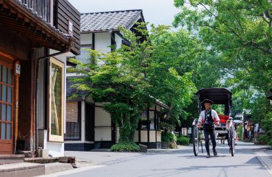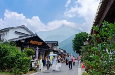 JR由布院駅から白滝橋を進むと、そこからは「湯の坪街道」と呼ばれるメインストリート。由布岳に向けて真っ直ぐに伸びる通りには、歴史深い由布院になじむ落ち著いた色合いの建物が並び、飲食店やお土産屋、ギャラリーなどが軒を連ねています。見上げると穏やかな稜線の豊後富士が、そぞろ歩く人々を遠くから見守っています。