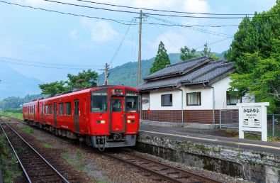 (寫真右)由布岳に見守られて走るJR久大本線の赤いディーゼルカー