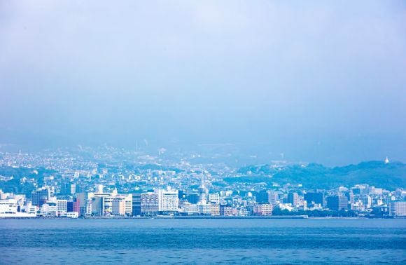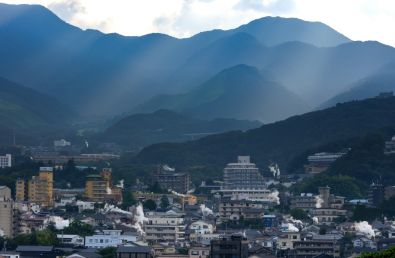 (寫真左)鶴見岳や扇山を背に、水蒸気が伸びる別府の溫泉街?!笢堡啶暾雇_」から撮影