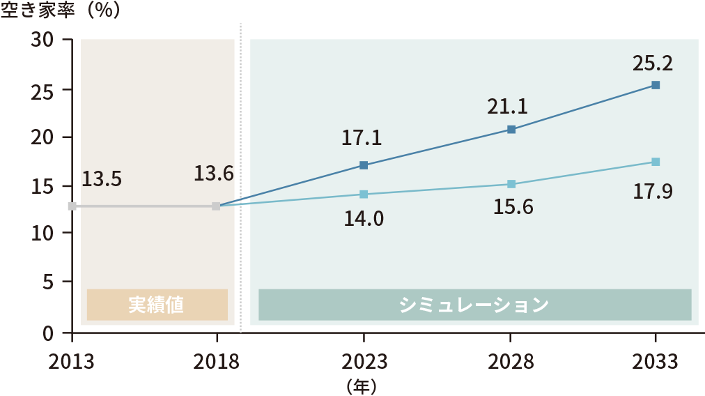 ※除卻率が2008年-12年度の水準(zhǔn)に戻る場(chǎng)合、2033年の空き家率は25.2%に上昇。