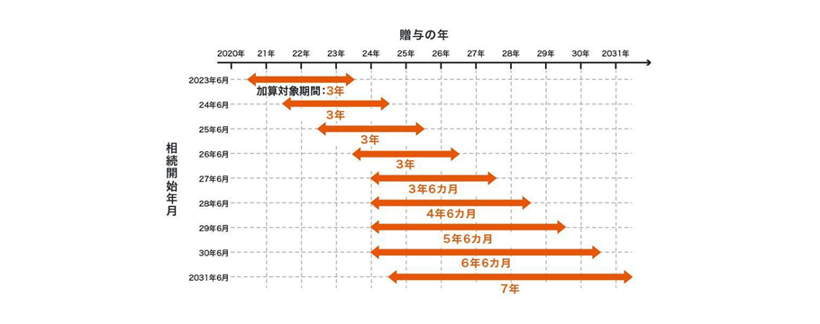 令和5年度稅制改正大綱において、「生前贈與加算」の対象期間が3年から7年に延長されました。生前贈與加算とは、亡くなった人から存命中に受けた贈與(生前贈與)について、相続した人の相続稅課稅額に対して、死亡前7年間 さかのぼって加算する規定です。4年以上の生前贈與加算が始まるのは2027年(令和9年)1月1日以降、7年分の加算が開始されるのは2031年(令和13年)1月1日以降の相続です。