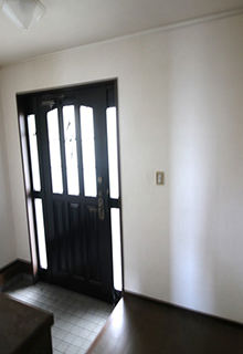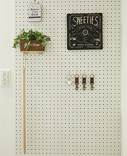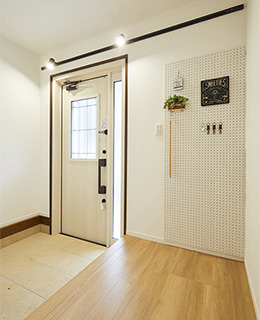 壁面に有孔化粧ボードを取り付け、鍵などの小物やお気に入りの寫真などを掛けられるスペースをつくりました。照明はシーリングライトからスポットライトに変え、リノベーション前とは異なる雰囲気を演出。靴で散らかりがちな玄関をすっきりと片付けられるよう、シューズボックスの収納量も増やしました。