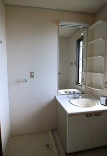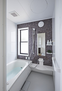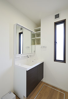 浴室?洗面室ともにリノベーション前はやや狹い印象があったため、全體的に床面積を広げています。それによってワンサイズ大きなユニットバスを導入でき、バスタイムをゆったりと過ごしていただけるようになりました。また、洗面室の壁面に設置された棚には、タオルや洗剤のストックを収納できます。