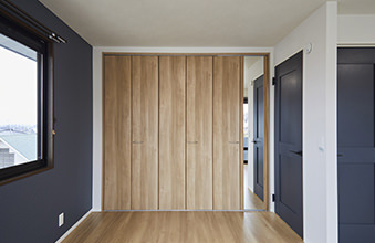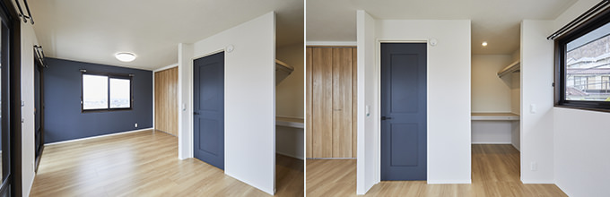 もともと洋室が2部屋ありましたが、壁をなくして1つの大きな空間に。ドアは2カ所にあるため、ライフスタイルの変化に合わせて分割することも可能です。また、収納を充実させるために設けたクローゼットとウォークインクローゼットは、季節ものの洋服や大型の荷物もすっきり片付けられるだけのスペースを確保。クローゼットの折れ戸に取り付けられた鏡は、コーディネートを考えたり身支度を整えたりするのに便利です。內裝は北歐スタイルを意識し、ナチュラルな床材にブルーの建具とアクセントクロスが映える印象的な空間になっています。