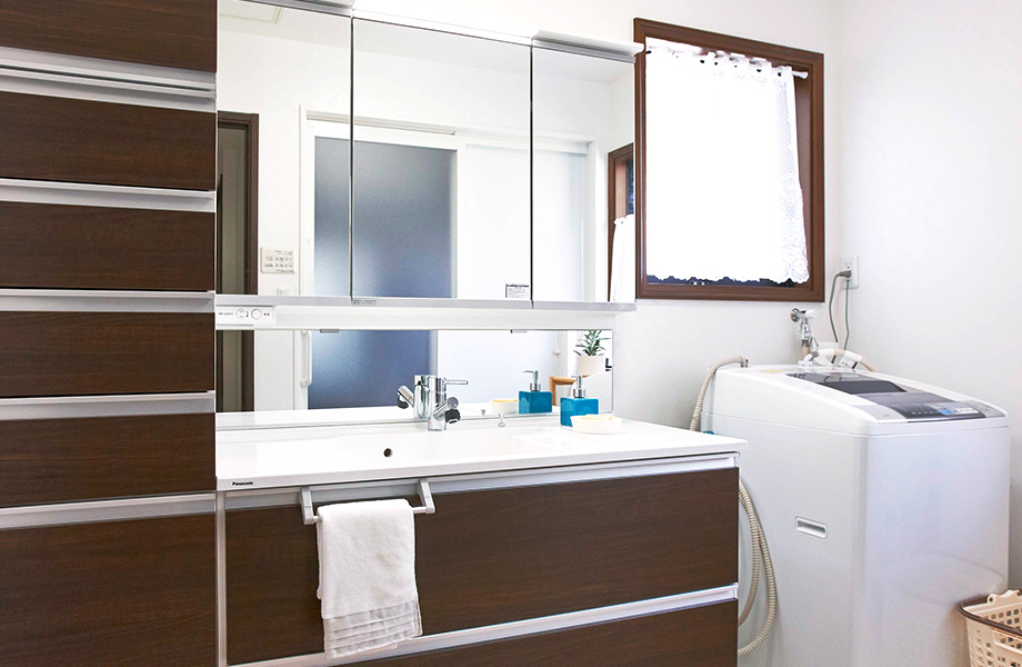 洗面室には、収納力たっぷりの洗面化粧臺。