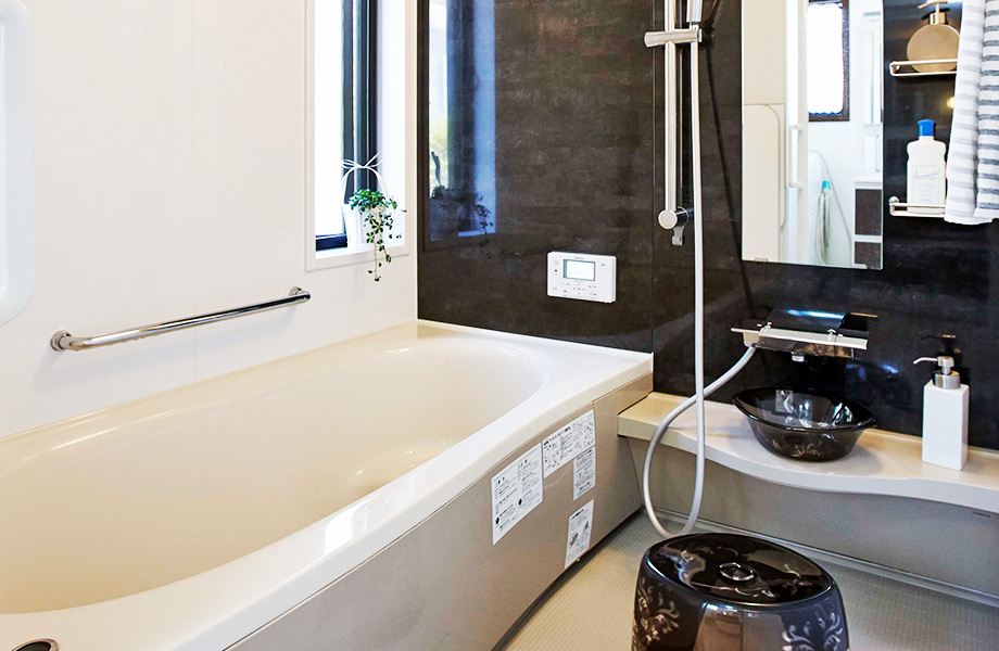 ホワイトとダークブラウンで統一されたバスルーム。浴室暖房乾燥機も備えます。