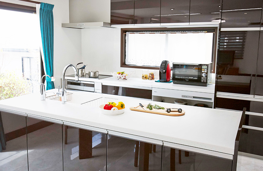 北側にあり暗かったキッチンを南側に移動。アイランド型オープンキッチンを採用してリビングと一體の空間とし、2方向から光を取り入れることで、とても明るく気持ちのいい場所になりました。
