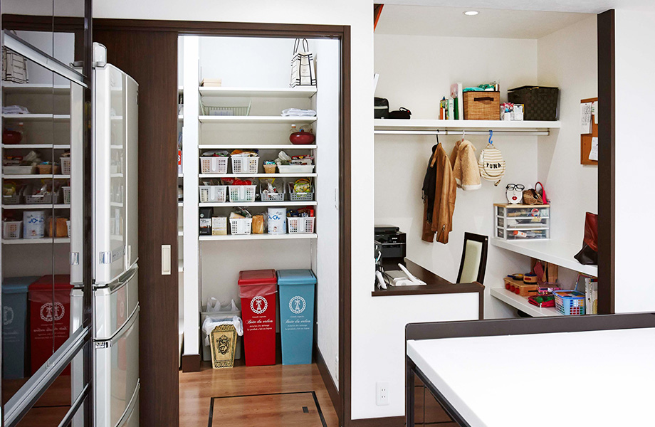 キッチンの隣には、ウォークインタイプの大型パントリーとパソコンコーナー。子どもたちのおもちゃや衣類もここにしまって、リビングはいつもスッキリ。