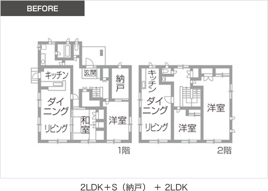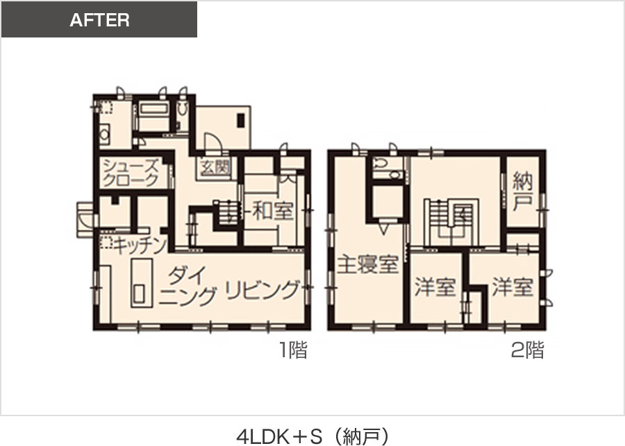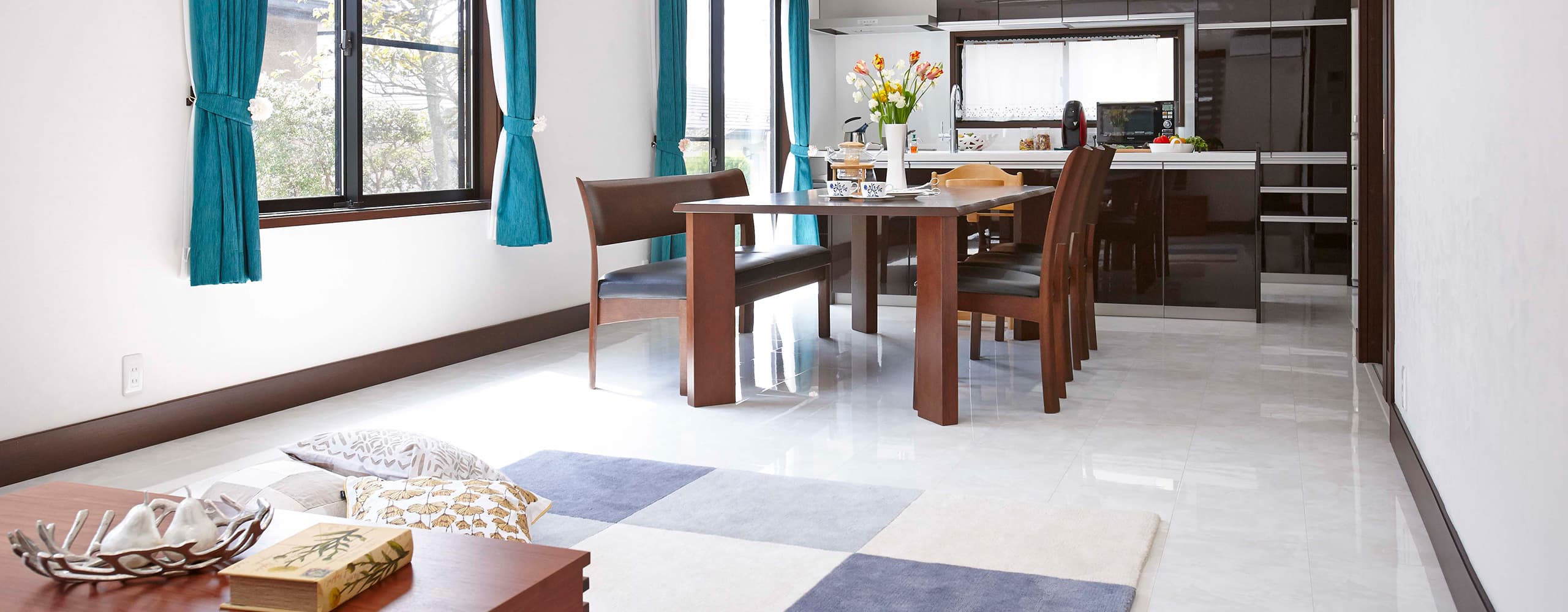 「庭のある広い家で子どもたちを育てたい。しかし、新築でそのような家となると、どうしても不便な場所になってしまう」――。そう考えたT様は、便利な場所に中古の戸建住宅を買い、住みよくリノベーションしようと決めました。候補を絞ったところで物件チェックを依頼した先が、大和ハウスリフォーム。図面で強度を、現場で建物や基礎の狀態を確認したうえで、大和ハウスリフォームがおすすめしたのが、構造的にしっかりした築20年の2世帯住宅でした。そして大幅な間取り変更を経て、明るく広いLDKとたっぷり収納のある、ゆとりある住空間へと生まれ変わったのです。