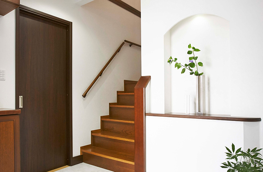 玄関ホールには正面にニッチを設け、奧行きとホスピタリティを感じさせる空間に仕上げました。