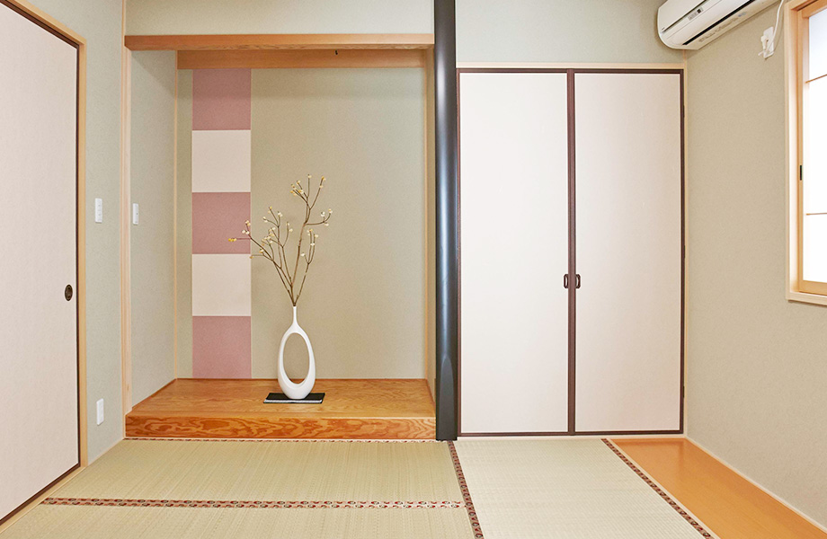 リビングから続く和室は、引き戸を閉めれば獨立した客間に。床の間や障子のデザインに、ご家族の遊び心が感じられます。