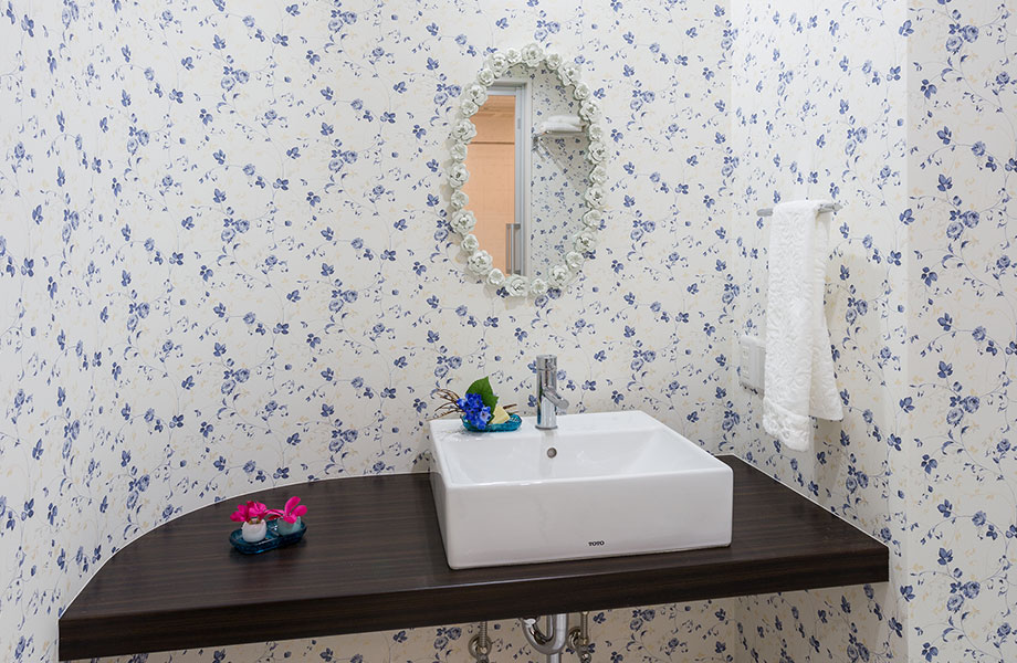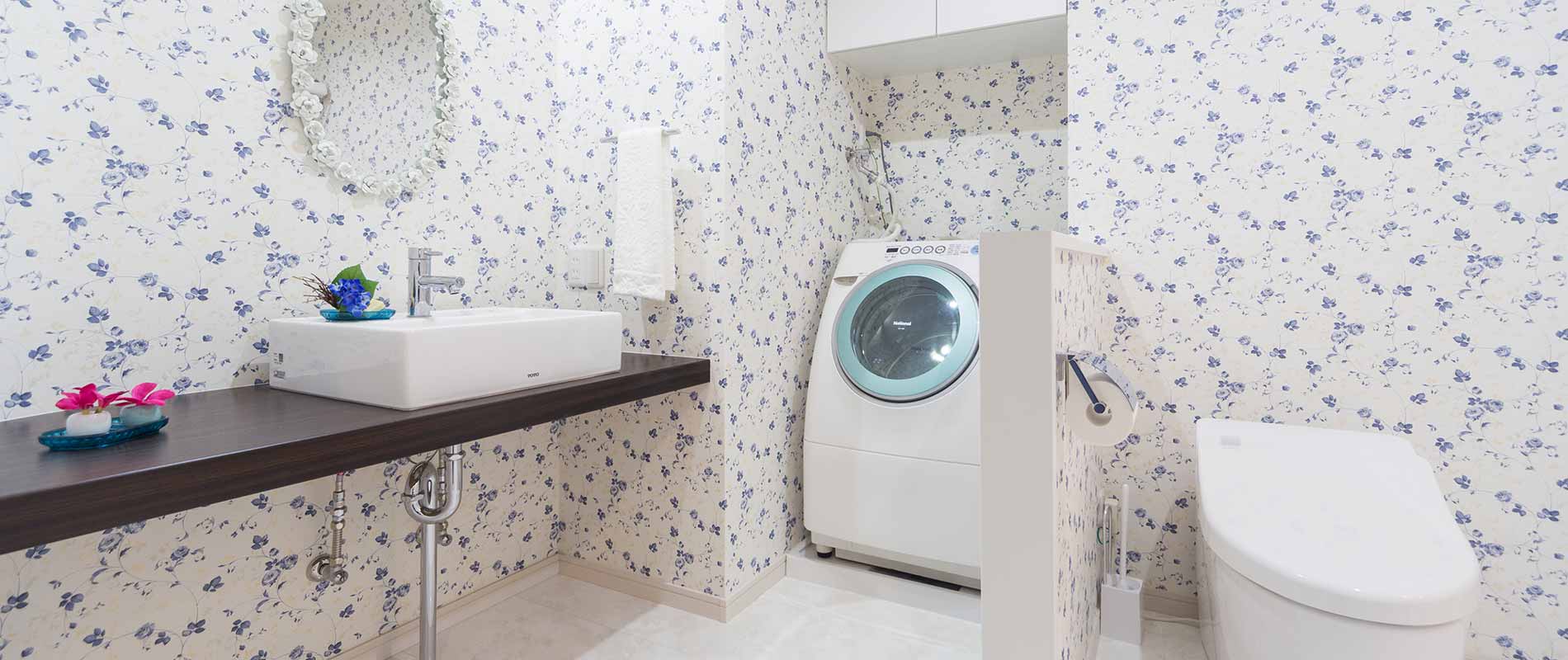 それぞれ獨立していた洗面室とトイレは一體化して、ゆとりあるレストルームに。青い小花柄のクロス、アールを描いた壁に造作したシンプルな洗面臺、O様がクロスに合わせて探したミラーなどで、ホテルライクな仕上がりになりました。