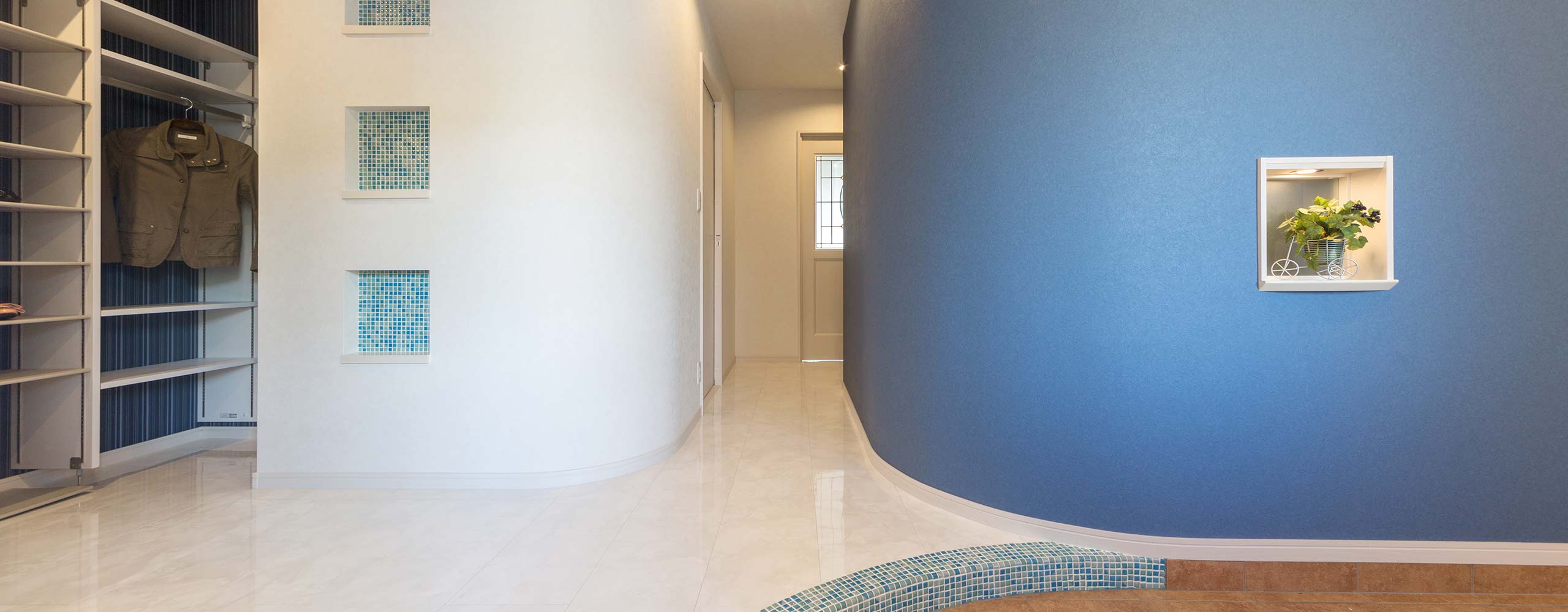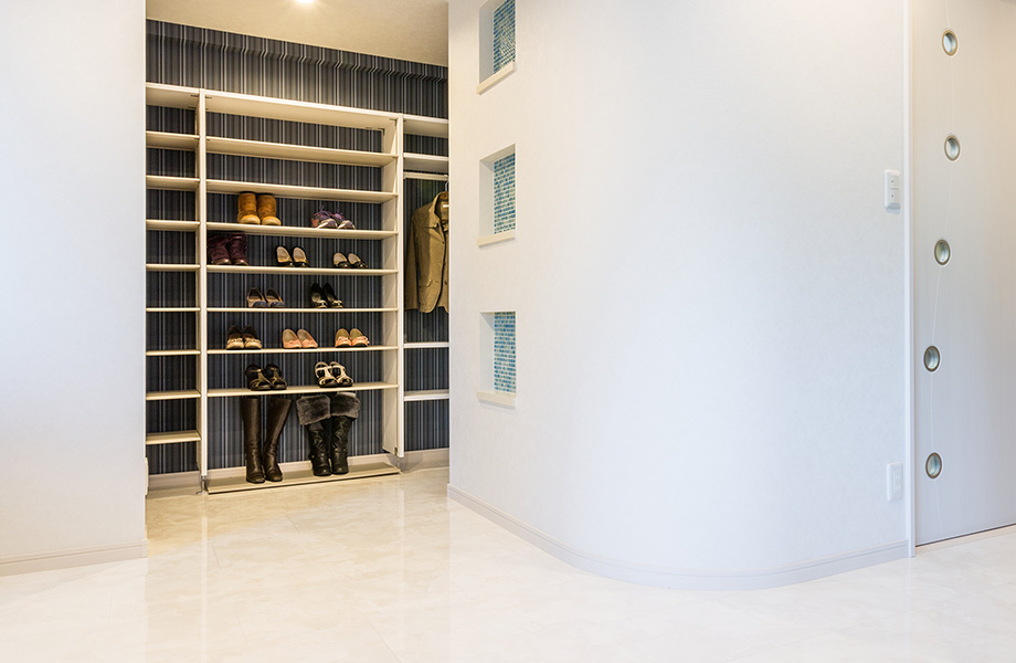 両側にあった洋室スペースを利用して、大きく広げた玄関。自転車を入れられるテラコッタタイルを張った土間スペース、大容量の土間収納やシューズクロークを実現しました。アールの壁の青いクロスやモザイクタイル、大理石調のフローリングが地中海のリゾートホテルのような雰囲気を演出しています。