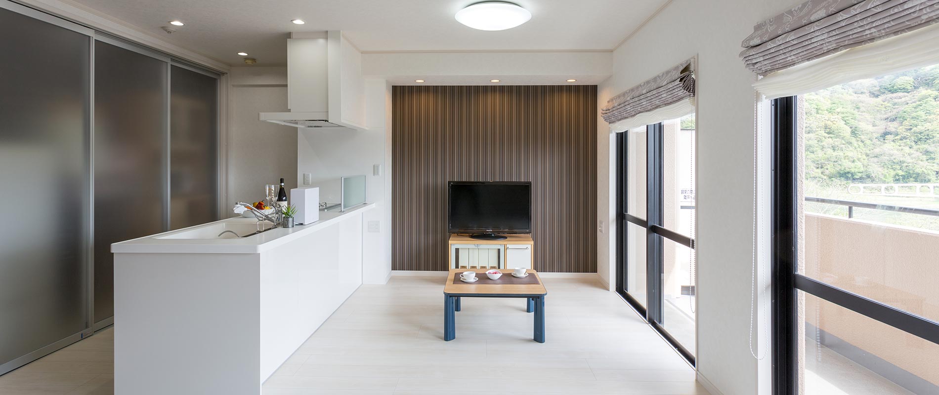 もともと和室だったスペースを取り込んで、20畳ものLDKを実現。白を基調とした內裝を希望されていたため、壁?天井はもちろんフローリングも白系を採用。テレビ背面の壁だけダークカラーのクロスにし、奧行を感じさせるように工夫しました。