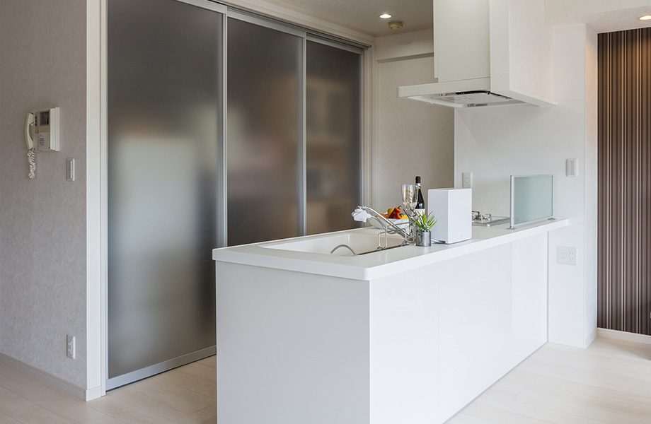 吊り戸棚があって半獨立型だったキッチンはオープンなペニンシュラ型に変更。背面には、冷蔵庫や食器棚も入れられ、半透明の引き戸で目隠しできる大容量の収納を設けました。